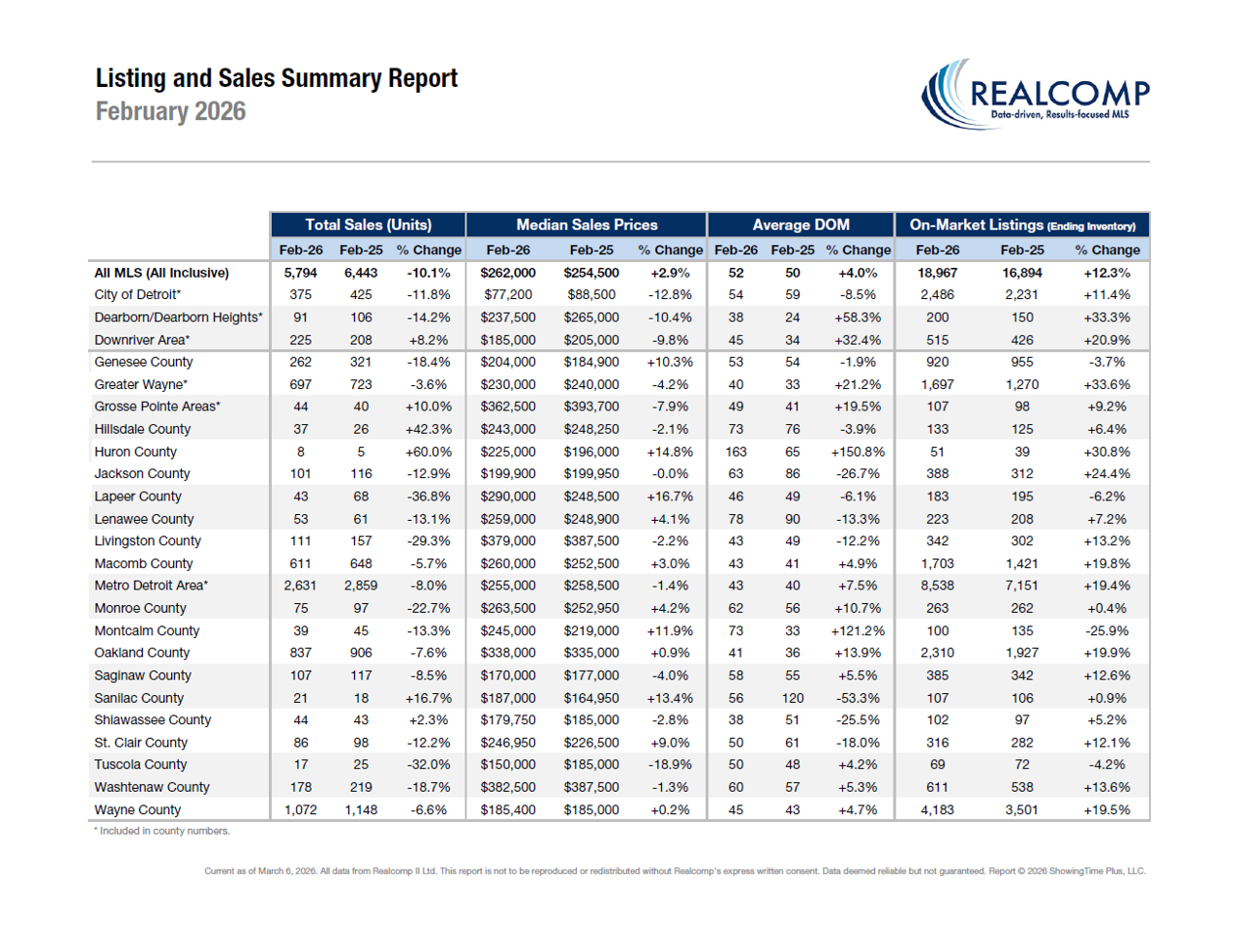 “It was heartening to see more homes entering the marketplace in February,” said Karen Kage, CEO, Realcomp II Ltd. “With Spring fast approaching we are hopeful it is a positive sign for good things to come.”
